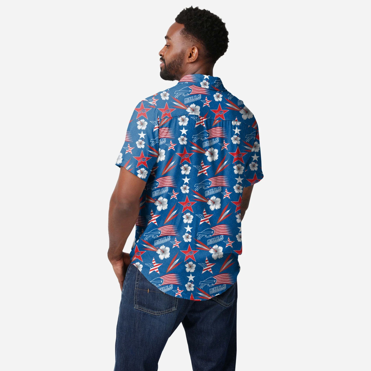 Stars + stripes + team spirit + style = The Buffalo Bills Americana Button Up Shirt. Dress to impress, all summer long!