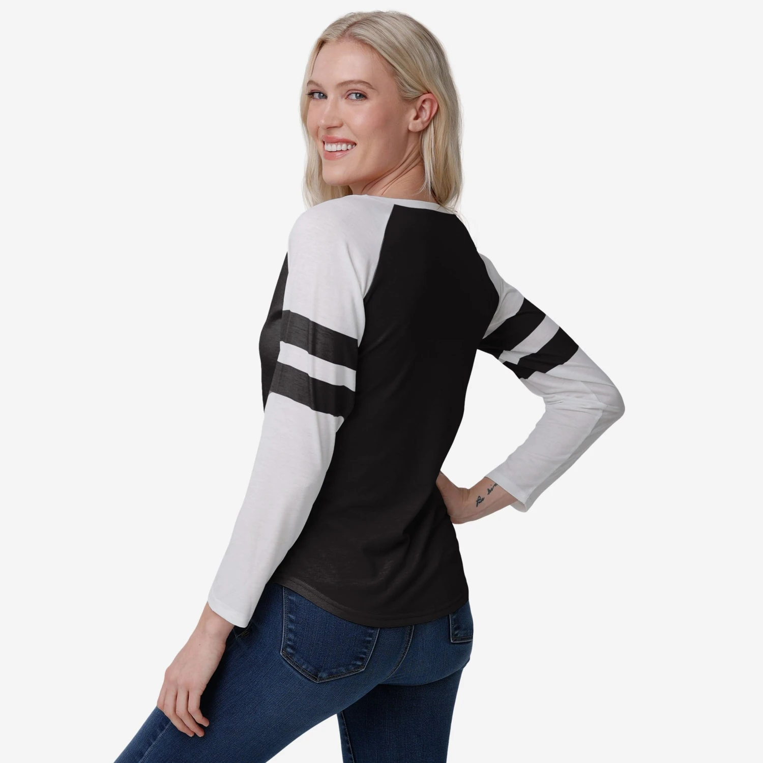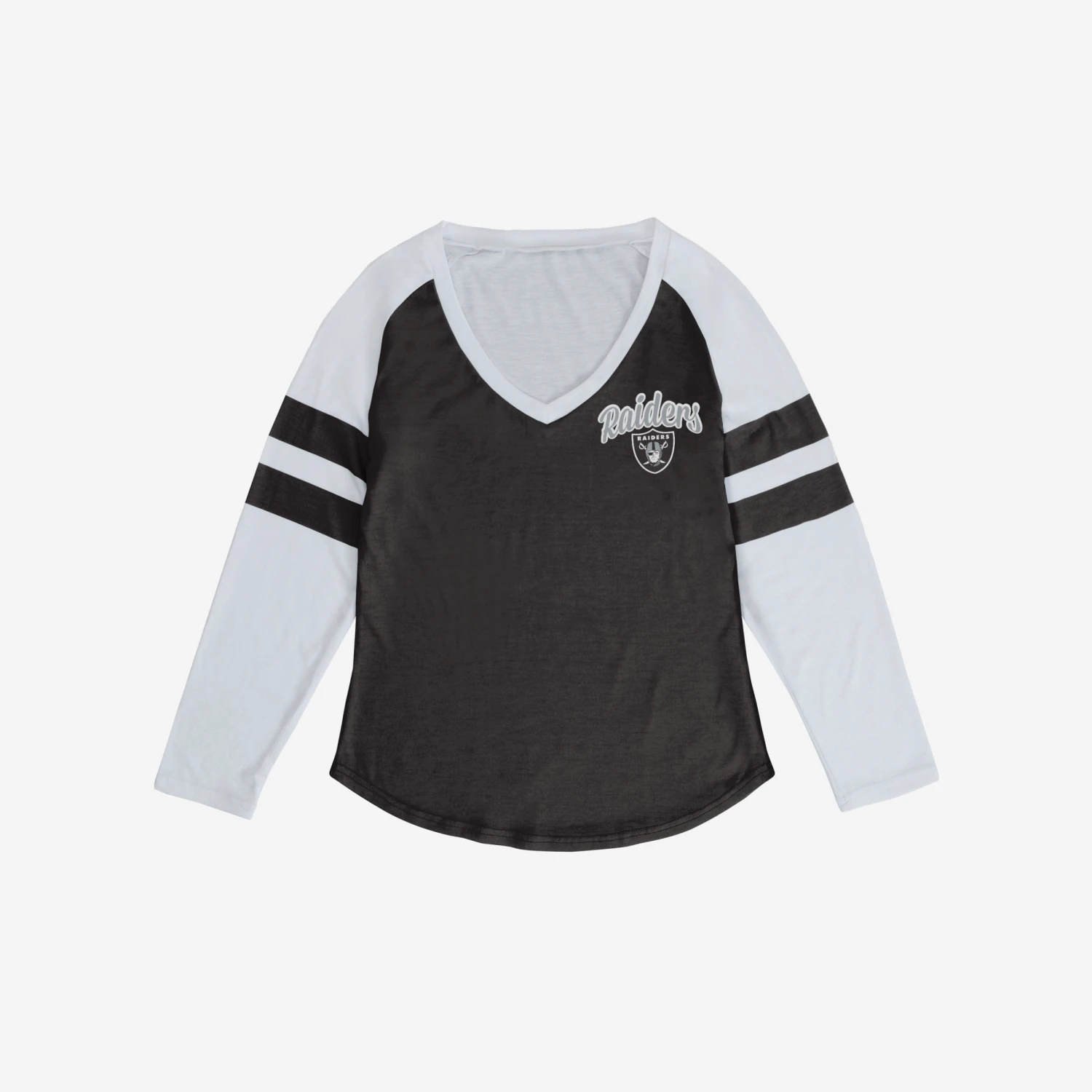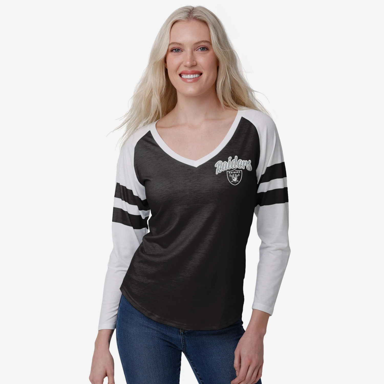 You couldn’t script this fan fit better. Show off your fandom AND your fashion sense with this Las Vegas Raiders Women’s Script Wordmark Striped Sleeve Raglan T-Shirt.