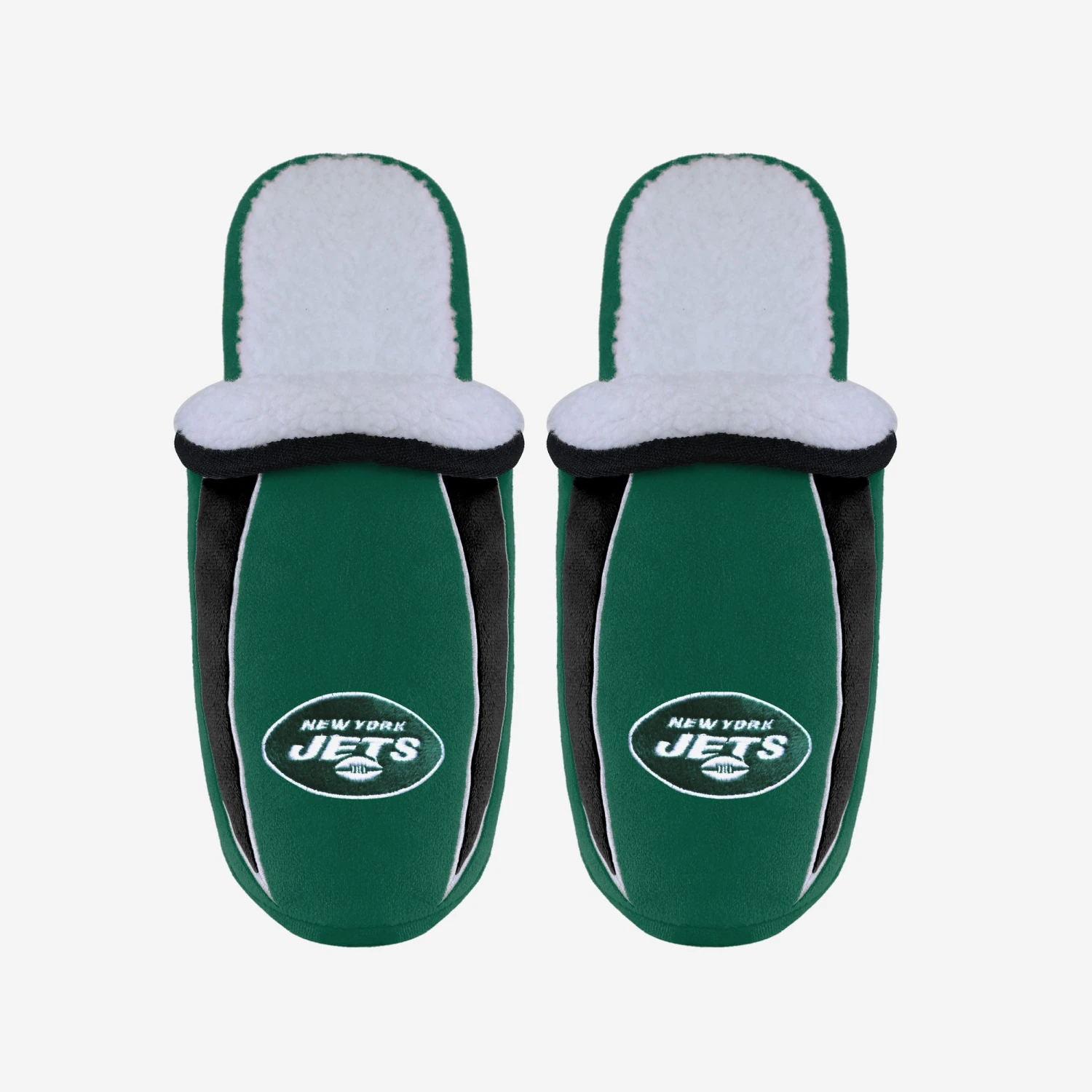 Kicking back, putting your feet up and watching the big game on the big screen in the fancave is great. You know what’s even greater? Doing all that while wearing these New York Jets Sherpa Slide Slippers.